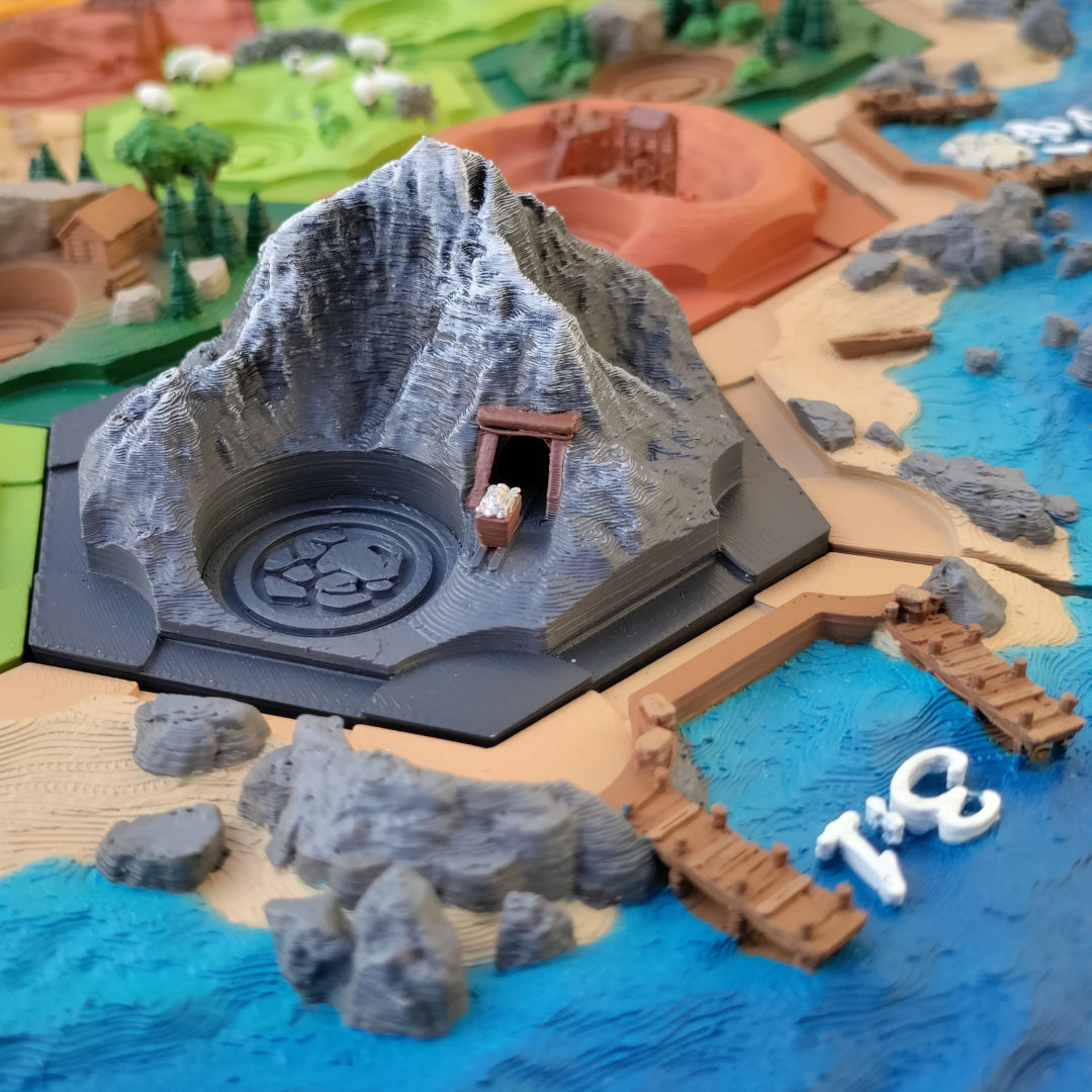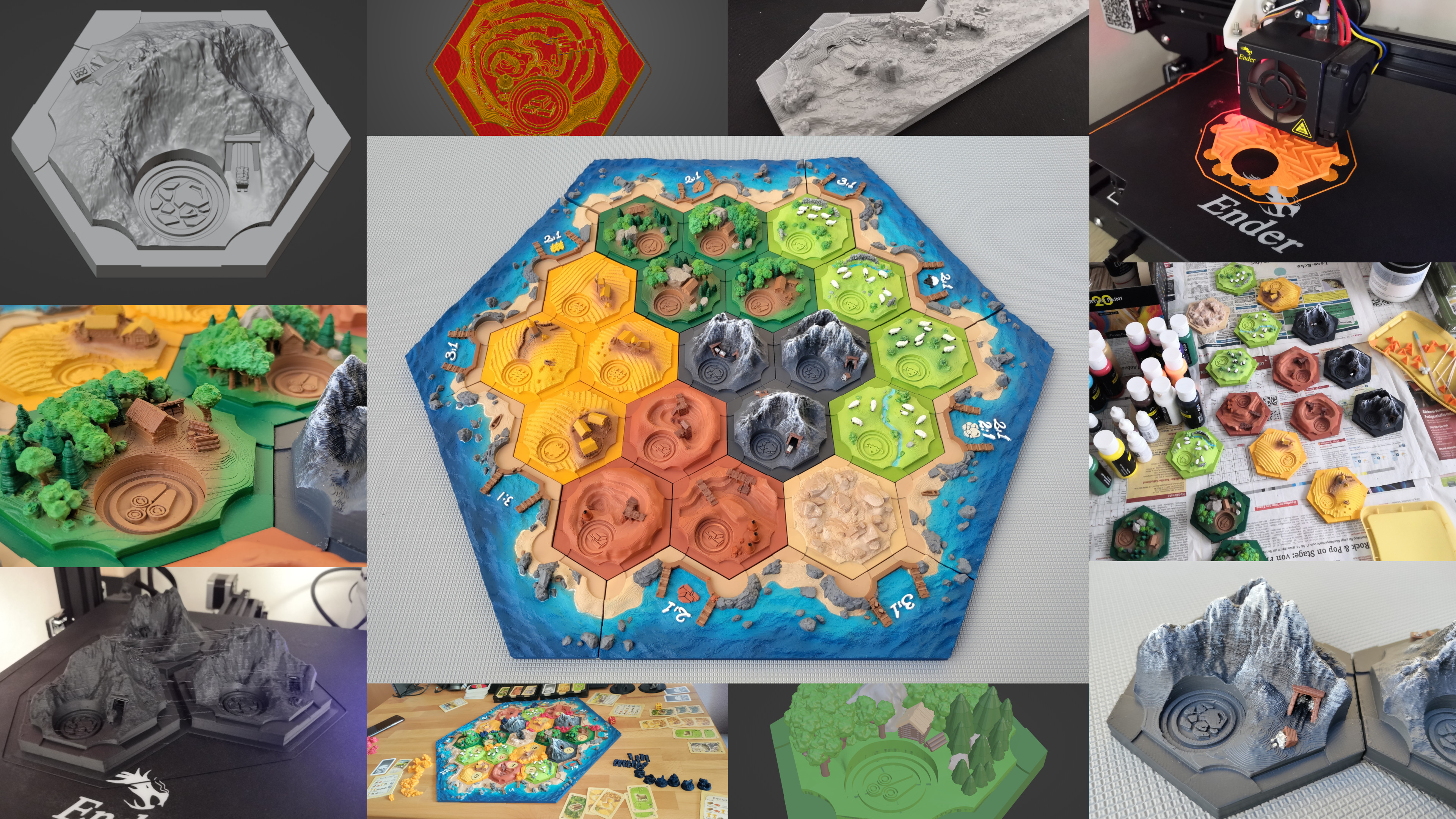 I'm a fan of Settlers of Catan, and I've designed my own 3D version of the game. This project involved 3D modeling, 3D printing, painting, and extensive testing. I created unique game hexagons that can be swapped with the standard cardboard tiles for a more immersive gameplay experience.